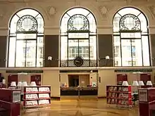 Comme tous les espaces publics de la bibliothèque, le hall d’entrée a des proportions majestueuses, le sol est orné de carrelage en mosaïque polychrome. Le sas monumental en verre agrafé date de la rénovation de 2003.