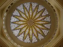 Centre de la composition, la coupole domine à quatorze mètres de hauteur, elle est en béton orné de pavés de verre de couleur dessinant une rosace, éclairée par des lanternons.