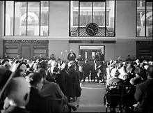 Le second hall abritait le vestiaire et l’accès aux toilettes du sous-sol. On y voit encore les plaques relatives à l’inauguration : tous les artistes et les entreprises ayant participé au chantier sont cités.