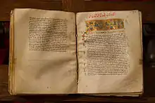 Codex Guta-Sintram, manuscrit de 1154 rédigé par la nonne Guta von Schwarzenthann (à dr.) et illustré par le moine Sintram von Marbach (à g.).