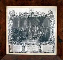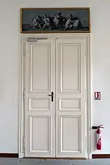Dessus-de-porte : putti avec un livre et l'abbaye à l'arrière-plan à droite.