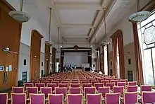 La grande salle de lecture surmontée d'une coupole de 3300 dalles de verre, est ornée de bas-reliefs de bois sculptés par Frédéric Steiner, collaborateur de Louis Majorelle[28].