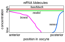 Les quatre gradients de protéines sont donc mis en place chez l’embryon précoce : Bicoïd et Hunchback concentrés dans la région antérieure et Nanos et Caudal dans la partie postérieure. Ces protéines (Bicoïd, Caudal et Hunchback) vont agir comme des facteurs de transcriptions afin de réguler l’expression des gènes zygotiques[13].
