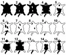 La proportion du blanc dans la robe varie énormément, de quelques poils blancs perdus dans la couleur à une robe presque entièrement blanche[Note 3]. Une échelle de blanc numérotée de 1 (absence de panachure) à 10 (chat entièrement blanc) permet de spécifier le patron du chat bicolore[3]. Toutefois, trois patrons sont traditionnellement distingués[9] :