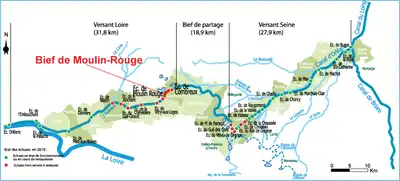 Le bief de Moulin-Rouge s’étend sur une longueur de 1 500 m entre l’écluse du Combreux en amont et l’écluse de Moulin-Rouge en aval[A 10]. Il est situé pour partie sur la commune de Vitry-aux-Loges et pour partie sur la commune de Combreux.