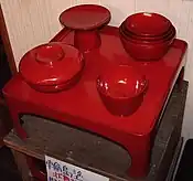 | Laque | Wajima-nuri (輪島塗)[131],[132],[122] | Un mélange de kieselguhr brûlé, de pâte de riz et de laque est utilisé pour les couches de fond, le premier exemple, les portes de Juzo-jinja, date de 1524 | Préfecture d'Ishikawa | 1977 | ![]() |