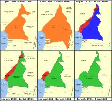 Mais la Première Guerre mondiale éclate en 1914. Au Kamerun elle oppose l'Allemagne, d'un côté, à la France et le Royaume-Uni de l'autre, dès le 5 août 1914[3]. L'Allemagne capitule au Kamerun en 1916, laissant le territoire aux belligérants vainqueurs que sont la France et le Royaume-Uni. Le traité de Versailles du vient entériner la partition du territoire en deux. On parle alors de territoires sous mandat de la Société des Nations (SDN) dont l'administration est confiée à la France pour les 3/4 (Cameroun français) et au Royaume-Uni pour les 1/4 (Cameroun britannique)[4].