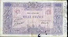 Le recto d'un billet de 1 000 francs bleu et rose imprimé en 1922.