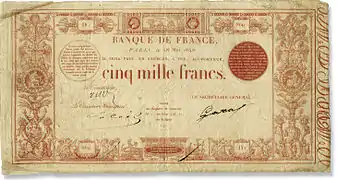La deuxième expérience de billet de banque français — juste après que, la Caisse d'escompte, assimilable à une banque privée, a lancé des coupons gagés sur ses fonds propres à partir de 1776, papier qui n'est pas considéré comme monnaie — fut celle des assignats suivie par les promesses de mandats territoriaux et les rescriptions de l'emprunt forcé. L'aventure des assignats commença en 1790 et se termina en 1797. L'émetteur central fut la caisse de l’Extraordinaire, dépendant du Gouvernement, mais l'on vit apparaître parallèlement de nombreuses vignettes dite de monnaie de nécessité. À partir de 1795, les vignettes furent libellées en une nouvelle unité de compte, le franc, suivant le système décimal.
