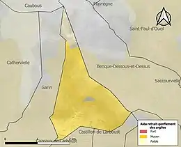 La commune est vulnérable au risque de mouvements de terrains constitué principalement du retrait-gonflement des sols argileux[28]. Cet aléa est susceptible d'engendrer des dommages importants aux bâtiments en cas d’alternance de périodes de sécheresse et de pluie. 90,1 % de la superficie communale est en aléa moyen ou fort (88,8 % au niveau départemental et 48,5 % au niveau national). Sur les 29 bâtiments dénombrés sur la commune en 2019, 29 sont en aléa moyen ou fort, soit 100 %, à comparer aux 98 % au niveau départemental et 54 % au niveau national. Une cartographie de l'exposition du territoire national au retrait gonflement des sols argileux est disponible sur le site du BRGM[29],[Carte 3].