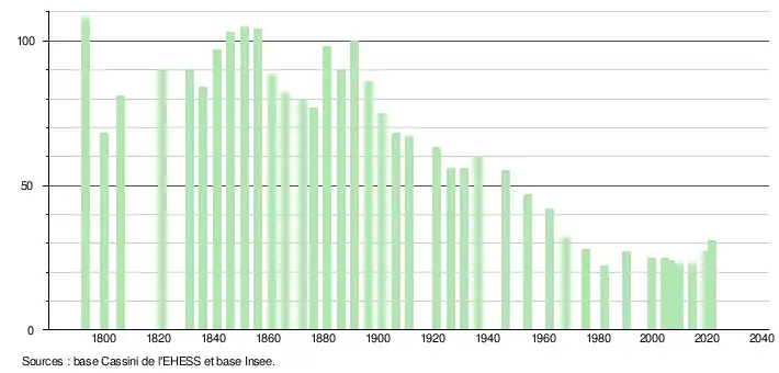 L'évolution du nombre d'habitants est connue à travers les recensements de la population effectués dans la commune depuis 1793. Pour les communes de moins de 10 000 habitants, une enquête de recensement portant sur toute la population est réalisée tous les cinq ans, les populations légales des années intermédiaires étant quant à elles estimées par interpolation ou extrapolation[33]. Pour la commune, le premier recensement exhaustif entrant dans le cadre du nouveau dispositif a été réalisé en 2004[34].