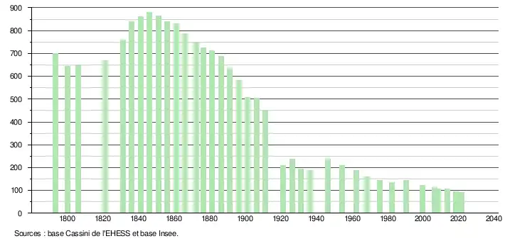 L'évolution du nombre d'habitants est connue à travers les recensements de la population effectués dans la commune depuis 1793. Pour les communes de moins de 10 000 habitants, une enquête de recensement portant sur toute la population est réalisée tous les cinq ans, les populations légales des années intermédiaires étant quant à elles estimées par interpolation ou extrapolation[22]. Pour la commune, le premier recensement exhaustif entrant dans le cadre du nouveau dispositif a été réalisé en 2008[23].