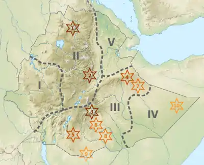 L'Éthiopie abrite plusieurs centres d'endémisme, des zones spécifiques présentant un nombre considérable d'espèces végétales endémiques : cinq dans les régions d’altitude et cinq à basse altitude. Les monts Simien, site du patrimoine mondial et parc national, constituent le centre le plus important pour les plantes montagnardes et afroalpines[32]. Plus de 1 700 espèces y ont été recensées (30 % de la flore vasculaire totale), dont 245 endémiques (41 % du total), certaines étant absentes ailleurs, comme Festuca gilbertiana (sv), Rosularia simens ou Dianthus longiglumis (sv). Le massif du Balé, un autre parc national déjà largement connu pour ses mammifères endémiques, ainsi que le plateau de Sanetti et la forêt d'Harenna, abritent la plus grande diversité végétale : plus de 3 500 espèces (61 %), dont 259 endémiques (44 %). Le centre est particulièrement remarquable pour ses espèces uniques de lobélies (par exemple, Lobelia rhynchopetalum) et de séneçons. Nettement moins étudiée, la partie orientale de la région floristique du Haut-Shewa constitue un troisième centre majeur d'endémisme en altitude. La zone autour de la ville de Debre Berhan comprend en effet plusieurs forêts, dont celle de Wof Washa, et les escarpements à l'est et au sud-est de la région sont couverts par une végétation unique récemment mise en évidence : la formation buissonnante semi-sempervirente de transition. Ce centre comprend plus 2 700 espèces de plantes (47 %), dont 230 endémiques (39 %) telles Inula confertiflora, Senecio myriocephalus et Solanecio gigas[33].