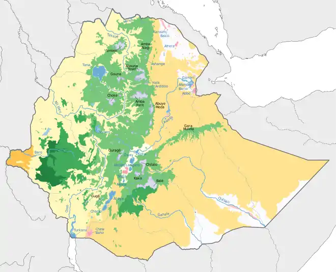 Alors qu'elle est plutôt rare dans les autres pays africains, la végétation alpine et subalpine est largement répandue en Éthiopie. Elle s'étend sur les hauts plateaux à partir de 3 200 m d'altitude, ce qui inclut les principaux sommets du pays, comme l'Amba Alagi (3 440 m), le Choke (en) (4 070 m), les monts Simien (4 620 m au Ras Dashan), l'Abouna Yosef (en) (4 260 m), le Gurage (3 720 m), le Gugé (4 176 m), le Chilalo (4 139 m) ou le massif du Balé (4 377 m au Tullu Dimtu). Elle se caractérise par la combinaison de lobélies géantes formant des rosettes surélevées, de plantes en coussin du genre Helichrysum, d'espèces arbustives du genre Alchemilla, et de graminées tempérées (genres Festuca, Poa, Deschampsia, etc.)[14]. Les zones afroalpines comportent de nombreuses espèces animales et végétales endémiques et font donc l'objet de plusieurs zones nationales protégées. La végétation actuelle ne représente que les vestiges d'une couverture bien plus importante, qui a largement disparu en raison de l'activité anthropique massive des XIXe et XXe siècles[15].