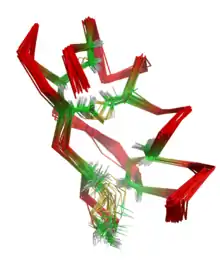 Un projet de RMN biologique structurale va utiliser un échantillon en solution de la macromolécule et enregistrer des spectres contenant des corrélations des deux types ci-dessus (scalaires et dipolaires). À partir de ces spectres, on va réaliser l'analyse des différents signaux, qui vont être individuellement attribués à chaque atome de la molécule. Cette phase s'appelle l'attribution spectrale. Ensuite, on va collecter un ensemble de données géométriques sur la molécule (distances inter-atomiques, angles dièdres…), appelées contraintes. À partir de ces informations géométriques locales, on va reconstruire par le calcul une structure 3D compatible avec ces contraintes : la structure RMN en solution[4]. Pour cela, on part d'une conformation aléatoire de la molécule, à laquelle on ajoute progressivement les contraintes pour induire son repliement, à l'aide des contraintes. Ce processus est répété à partir de plusieurs conformations initiales différentes, afin de vérifier que le calcul converge vers une solution unique. Pour cette raison, les structures RMN de macromolécules sont en général constituées d'un ensemble de conformations proches.