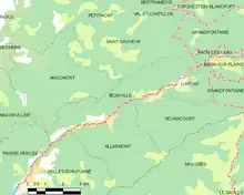 - le Haut de la Borne à 609 mètres dominant le col de la Borne à 578 mètres, où grimpait autrefois le prestigieux chemin d'Allarmont pour se rendre de Senones ou Moussey à Saint-Sauveur. La bande faîtière proche de ces hauteurs bionvilloises, ainsi que les Roches Ganaux à quelques mètres de l'ancien pas ou col, appartiennent à la commune d'Angomont, lointaine héritière des parcours entre les chaumes sommitales des Planches et des Breheux.