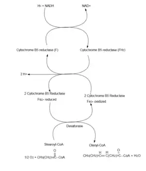 La désaturation des acides gras requiert de l'oxygène O2, du NADH+H+ et le cytochrome b5. Cette réaction, qui se déroule dans le réticulum endoplasmique, conduit à l'oxydation à la fois de l'acide gras et du NADH. La réaction de désaturation la plus courante introduit une double liaison entre les atomes de carbone 9 et 10 par une Δ9-acide gras désaturase, mais les Humains possèdent également des Δ6, Δ5 et Δ4-désaturases.