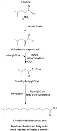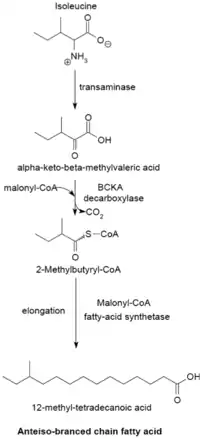 Les α-cétoacides intervenant comme amorces dérivent de la transamination et de la décarboxylation de la valine, de la leucine et de l'isoleucine pour donner respectivement de l'isobutyryl-CoA, de la 3-méthylbutyryl-CoA, et de la 2-méthylbutyryl-CoA[13]. La première amorce, issue de la valine, donne des acides gras de structure iso à nombre pair d'atomes de carbone tels que l'acide 14-méthylpentadécanoïque (isopalmitique) tandis que la deuxième, issue de la leucine, peut donner des acides gras de structure iso à nombre impair d'atomes de carbone tels que l'acide 13-méthyltétradécanoïque, et que la troisième, issue de l'isoleucine, conduit aux acides gras de structure antéiso à nombre impair d'atomes de carbone tels que l'acide 12-méthyltétradécanoïque[14].