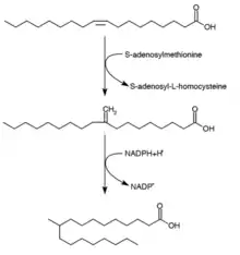 L'acide tuberculostéarique, ou acide 10-méthylstéarique, est un acide gras saturé synthétisé par les espèces de bactéries du genre Mycobacterium et par deux espèces du genre Streptomyces. Il est produit à partir d'un acide gras monoinsaturé, l'acide oléique. Après estérification de ce dernier sur un phospholipide, la S-adénosylméthionine donne un groupe méthyle sur la double liaison de cet acide gras[17]. Cette méthylation donne l'intermédiaire 10-méthylèneoctadécanoyle, qui est ensuite réduit avec du NADPH pour donner de l'acide 10-méthylstéarique, c'est-à-dire de l'acide tuberculostéarique[13].