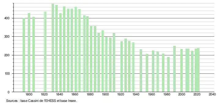 L'évolution du nombre d'habitants est connue à travers les recensements de la population effectués dans la commune depuis 1793. Pour les communes de moins de 10 000 habitants, une enquête de recensement portant sur toute la population est réalisée tous les cinq ans, les populations légales des années intermédiaires étant quant à elles estimées par interpolation ou extrapolation[15]. Pour la commune, le premier recensement exhaustif entrant dans le cadre du nouveau dispositif a été réalisé en 2008[16].