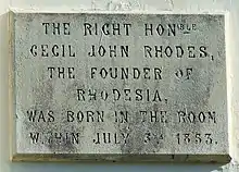 Plaque mentionnant le lieu de naissance de Cecil Rhodes, fondateur de la Rhodésie