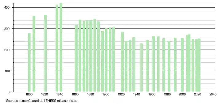L'évolution du nombre d'habitants est connue à travers les recensements de la population effectués dans la commune depuis 1800. Pour les communes de moins de 10 000 habitants, une enquête de recensement portant sur toute la population est réalisée tous les cinq ans, les populations légales des années intermédiaires étant quant à elles estimées par interpolation ou extrapolation[21]. Pour la commune, le premier recensement exhaustif entrant dans le cadre du nouveau dispositif a été réalisé en 2008[22].