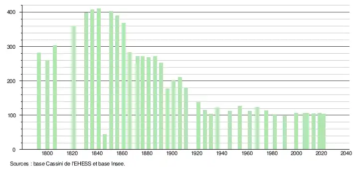 L'évolution du nombre d'habitants est connue à travers les recensements de la population effectués dans la commune depuis 1793. Pour les communes de moins de 10 000 habitants, une enquête de recensement portant sur toute la population est réalisée tous les cinq ans, les populations légales des années intermédiaires étant quant à elles estimées par interpolation ou extrapolation[22]. Pour la commune, le premier recensement exhaustif entrant dans le cadre du nouveau dispositif a été réalisé en 2008[23].