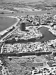 La France entreprend très tôt, en 1886, la construction d'un grand port du fait du rôle stratégique de la ville sur le canal de Sicile avec le creusement du chenal qui n'est achevé qu'en 1892 ; ce canal est creusé pour relier la mer Méditerranée au lac de Bizerte où est aménagée une rade. L'aménagement du port s'accélère notamment sous l'impulsion de l'amiral Gustave Besnard (ministre de la Marine) et du capitaine de vaisseau Joseph-Henri Merleaux-Ponty dans les années 1897-1898, avec la montée de la tension entre la France et le Royaume-Uni pendant la crise de Fachoda[16]. À une vingtaine de kilomètres plus au sud, de l'autre côté du lac, est fondée la cité de Ferryville, appelée de nos jours Menzel Bourguiba ainsi que l'arsenal de la marine de guerre française dit de Sidi-Abdallah. Sous le protectorat français, la ville croît rapidement : la municipalité de Bizerte est créée par le décret du [17]. En 1898, un pont transbordeur est édifié sur le canal pour joindre la ville à la rive sud du canal ; il reste en service jusqu'en 1909.