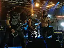 - Blackened death metal mêle death metal et black metal[75],[76]. Des exemples de groupes de blackened death metal sont Belphegor[77], Behemoth[78], Akercocke[79] et Sacramentum[80],Marduk (groupe).