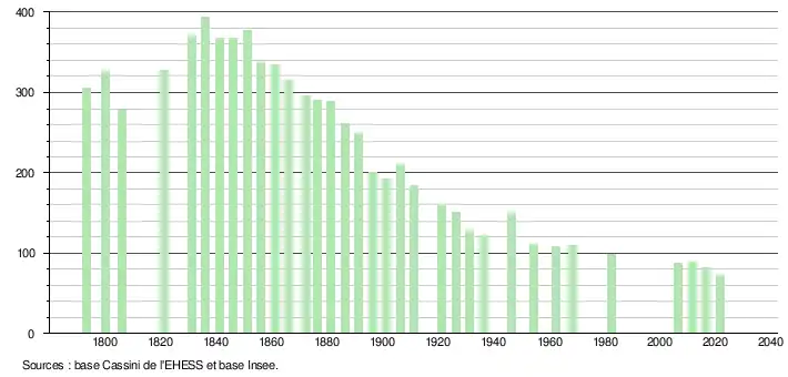 L'évolution du nombre d'habitants est connue à travers les recensements de la population effectués dans la commune entre 1793 et 1973, dans la commune associée de 1973 à 2016 et dans la commune déléguée depuis 2017. À partir de 2006, les populations légales des communes sont publiées annuellement par l'Insee. Le recensement repose désormais sur une collecte d'information annuelle, concernant successivement tous les territoires communaux au cours d'une période de cinq ans. Pour les communes de moins de 10 000 habitants, une enquête de recensement portant sur toute la population est réalisée tous les cinq ans, les populations légales des années intermédiaires étant quant à elles estimées par interpolation ou extrapolation[31]. Pour la commune déléguée, le premier recensement exhaustif, lié à celui de Colombey-les-Deux-Églises, entrant dans le cadre du nouveau dispositif a été réalisé en 2006[32].