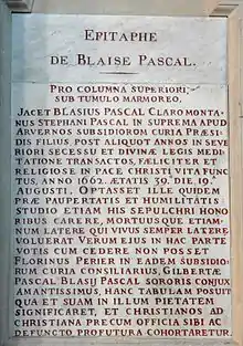 Le , Pascal vit sa « nuit de feu »[41],[42]. Il en consigne immédiatement le souvenir pour lui-même dans une note brève, connue sous le nom de « Mémorial » : « ✝ L’an de grâce 1654. Lundi 23 novembre, jour de saint Clément, pape et martyr […] Depuis environ dix heures et demie du soir jusques environ minuit et demi, feu. Dieu d’Abraham, Dieu d’Isaac, Dieu de Jacob, non des philosophes et des savants. Certitude, certitude. Sentiment. Joie. Paix […] » ; le manuscrit s’achève sur cette décision : « Renonciation totale et douce. Soumission totale à Jésus-Christ et à mon directeur », avec cette citation du Psaume 119, 16 : « Non obliviscar sermones tuos. Amen »[alpha 6]. Il coud soigneusement ce document dans son manteau et le transfère toujours quand il change de vêtement ; un serviteur le découvrira par hasard après sa mort.