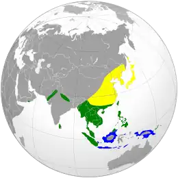 Les populations du centre et du nord de la Chine, de Russie, des deux Corées et du Japon sont nicheuses et migratrices. Les populations du centre et de l’est de l’Indonésie et de Nouvelle-Guinée sont non-nicheuses et migratrices.