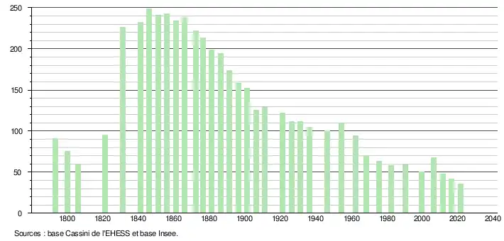 | L'évolution du nombre d'habitants est connue à travers les recensements de la population effectués dans la commune depuis 1793. Pour les communes de moins de 10 000 habitants, une enquête de recensement portant sur toute la population est réalisée tous les cinq ans, les populations légales des années intermédiaires étant quant à elles estimées par interpolation ou extrapolation[23]. Pour la commune, le premier recensement exhaustif entrant dans le cadre du nouveau dispositif a été réalisé en 2006[24]. En 2021, la commune comptait 36 habitants[Note 2], en diminution de 16,28 % par rapport à 2015 (Gers : +0,79 %, France hors Mayotte : +1,84 %). |
