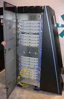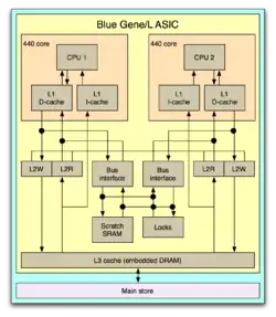 - ASIC intégrant deux contrôleurs embarqués PowerPC 440, un sous-système de mémoire cache et un de communication : 212 992 processeurs ()