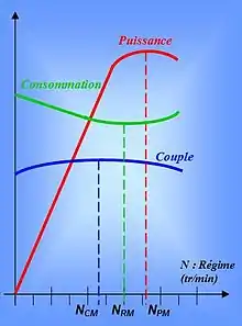 La plupart des moteurs ont des courbes caractéristiques externes (fonctionnement à pleine charge, c'est-à-dire accélérateur enfoncé) qui correspondent typiquement au schéma ci-contre. La série de rapports disponibles sur une boîte de vitesses est optimisée en prenant en compte ces courbes, établies en fonction de données relevées au banc d'essai à différents régimes de rotation (tous les 200 tr/min par exemple) :