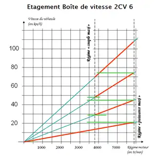 La 2CV Citroën et ses modèles dérivées ont été équipés d'une même boîte de vitesses, à l'architecture particulière, proposant 4 rapports dont 3 synchronisés et une marche arrière. Depuis 1949 jusqu'en 1990, la même disposition à 4 arbres deux à deux coaxiaux a été conservée. Les valeurs des rapports de transmission sont toutefois différentes pour chaque modèle en fonction de la masse du véhicule, de la puissance du moteur, et de l'utilisation envisagée du véhicule.