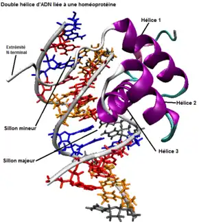 L’homéodomaine est une structure tridimensionnelle appelée hélice-tour-hélice (HTH) et comporte trois hélices alpha séparées par une boucle et un tour (voir figure 2). La troisième hélice alpha va venir s'insérer dans le sillon majeur de la double hélice d'ADN au moment de la reconnaissance et va rendre cette dernière active pour la transcription[4].