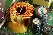 Dans une bobine enroulée sur un noyau en forme de tige droite, les lignes de champ magnétique émergeant d'une extrémité du noyau doivent traverser l'air pour réintégrer le noyau à l'autre extrémité. Cela réduit le champ, car une grande partie du trajet du champ magnétique se trouve dans l'air plutôt que dans le matériau du noyau à perméabilité plus élevée et constitue une source d'interférences électromagnétiques. Un champ magnétique et une inductance plus élevés peuvent être obtenus en formant le noyau dans un circuit magnétique fermé. Les lignes de champ magnétique forment des boucles fermées à l'intérieur du noyau sans quitter le matériau du noyau. La forme souvent utilisée est un noyau de ferrite toroïdal ou en forme de beignet. En raison de leur symétrie, les noyaux toroïdaux permettent à un minimum du flux magnétique de s'échapper à l'extérieur du noyau (appelé flux de fuite), de sorte qu'ils rayonnent moins d'interférences électromagnétiques que les autres formes. Les bobines à noyau toroïdal sont fabriquées à partir de divers matériaux, principalement la ferrite, la poudre de fer et les noyaux laminés[16].