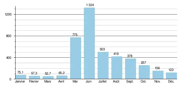 Le débit moyen mensuel observé en mars (minimum d'étiage) est de 52,7 m3/s, soit seulement 4 % du débit moyen du mois de juin (1 324 m3/s), ce qui souligne l'amplitude des variations saisonnières. Cependant les écarts de débits mensuels peuvent être encore bien plus importants d'après les années : sur la durée d'observation de 55 ans, le débit mensuel minimal a été de 14,8 m3/s en , tandis que le débit mensuel maximal s'élevait à 2 340 m3/s en . En ce qui concerne la période libre de glace (de mai à septembre inclus), toujours sur cette longue période de 55 ans, le débit minimal observé a été de 236 m3/s en , ce qui restait franchement abondant.