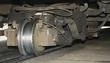 Un aiguillage sur la voie du TVR, à proximité de l'arrêt "Saint-Georges". Les deux rails étaient sur une plaque commune, qui pivotait en fonction du rail à aligner. Cet aiguillage était abandonné[11] depuis 2005, et a en conséquence été soudé sur le rail encore en service.