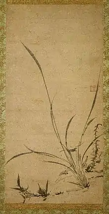 Les peintres-ermites possédés par l'esprit du zen œuvrent dans leur propre style. Délaissant la couleur, comme les maîtres continentaux de l'époque des Song, ils cultivent presque exclusivement la calligraphie (où ils s'imposent d'emblée magistralement) et le lavis d'encre (suiboku), technique qui exige un long apprentissage, mais autorise une liberté de traitement de l'image qui fascine très vite les artistes nippons: sur ce plan, ils vont plus loin encore que leurs modèles chinois. Ce ne sont pourtant pas les vastes horizons qui mobilisent leur regard. Ils préfèrent s'essayer d'abord à l'art intimiste du paysage rapproché, où ils conquièrent très vite une maîtrise confondante — qu'on en juge par les peintures de roseaux et d'oies sauvages du vieux maître Tesshû Tokusai (XIVe siècle), ou par ces simples herbes des talus qui fascinent si fort Bompō[2].