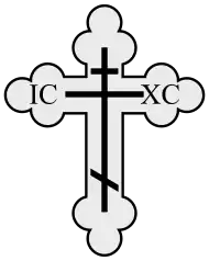 Dans une croix orthodoxe russe, la barre transversale inférieure inclinée représente non seulement le repose-pied mais aussi la balance de justice qui, selon les textes liturgiques orthodoxes, entraîne vers le bas le Mauvais Larron envoyé aux enfers et vers le haut le bon Larron allégé de ses fautes[14].