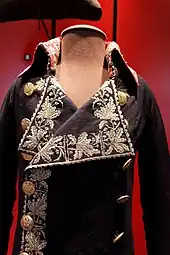 Ne pouvant convaincre Napoléon de poser pour le tableau, Jacques-Louis David s’inspire d’un buste pour la ressemblance[59], et fait poser son fils pour la posture du personnage. Mais il peut disposer de l’uniforme et du bicorne que Bonaparte portait à Marengo[60] dont il revêt un mannequin en bois. Étienne-Jean Delécluze évoque ce moment dans sa biographie de David :