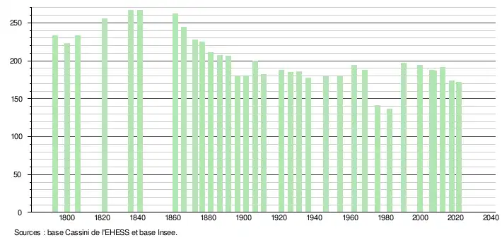 L'évolution du nombre d'habitants est connue à travers les recensements de la population effectués dans la commune depuis 1793. Pour les communes de moins de 10 000 habitants, une enquête de recensement portant sur toute la population est réalisée tous les cinq ans, les populations légales des années intermédiaires étant quant à elles estimées par interpolation ou extrapolation[19]. Pour la commune, le premier recensement exhaustif entrant dans le cadre du nouveau dispositif a été réalisé en 2007[20].