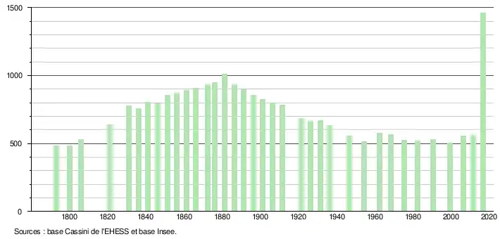 L'évolution du nombre d'habitants est connue à travers les recensements de la population effectués dans la commune depuis 1793. Pour les communes de moins de 10 000 habitants, une enquête de recensement portant sur toute la population est réalisée tous les cinq ans, les populations légales des années intermédiaires étant quant à elles estimées par interpolation ou extrapolation[17]. Pour la commune, le premier recensement exhaustif entrant dans le cadre du nouveau dispositif a été réalisé en 2006[18].