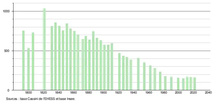 L'évolution du nombre d'habitants est connue à travers les recensements de la population effectués dans la commune depuis 1793. Pour les communes de moins de 10 000 habitants, une enquête de recensement portant sur toute la population est réalisée tous les cinq ans, les populations légales des années intermédiaires étant quant à elles estimées par interpolation ou extrapolation[20]. Pour la commune, le premier recensement exhaustif entrant dans le cadre du nouveau dispositif a été réalisé en 2006[21].