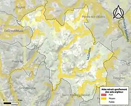 Le retrait-gonflement des sols argileux est susceptible d'engendrer des dommages importants aux bâtiments en cas d’alternance de périodes de sécheresse et de pluie. 27 % de la superficie communale est en aléa moyen ou fort (26,8 % au niveau départemental et 48,5 % au niveau national). Sur les 155 bâtiments dénombrés sur la commune en 2019, 37 sont en aléa moyen ou fort, soit 24 %, à comparer aux 36 % au niveau départemental et 54 % au niveau national. Une cartographie de l'exposition du territoire national au retrait gonflement des sols argileux est disponible sur le site du BRGM[16],[Carte 2].