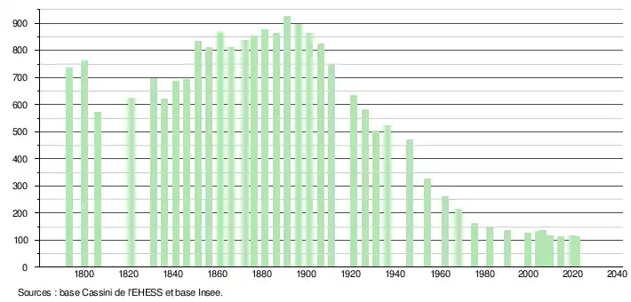 | L'évolution du nombre d'habitants est connue à travers les recensements de la population effectués dans la commune depuis 1793. Pour les communes de moins de 10 000 habitants, une enquête de recensement portant sur toute la population est réalisée tous les cinq ans, les populations légales des années intermédiaires étant quant à elles estimées par interpolation ou extrapolation[22]. Pour la commune, le premier recensement exhaustif entrant dans le cadre du nouveau dispositif a été réalisé en 2004[23]. En 2021, la commune comptait 114 habitants[Note 4], en augmentation de 0,88 % par rapport à 2015 (Corrèze : −0,86 %, France hors Mayotte : +1,84 %). |