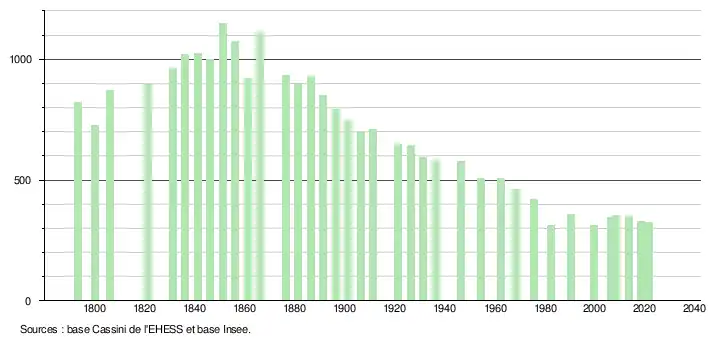 | L'évolution du nombre d'habitants est connue à travers les recensements de la population effectués dans la commune depuis 1793. Pour les communes de moins de 10 000 habitants, une enquête de recensement portant sur toute la population est réalisée tous les cinq ans, les populations légales des années intermédiaires étant quant à elles estimées par interpolation ou extrapolation[28]. Pour la commune, le premier recensement exhaustif entrant dans le cadre du nouveau dispositif a été réalisé en 2008[29]. En 2021, la commune comptait 324 habitants[Note 6], en diminution de 8,47 % par rapport à 2015 (Hautes-Pyrénées : +1,04 %, France hors Mayotte : +1,84 %). |