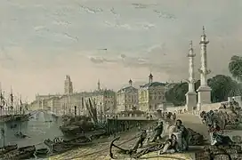 La ville de Bordeaux est traversée par la Garonne[19]. Elle sépare la rive gauche et la rive droite de la ville par une largeur de 450 mètres[alpha 3]. C'est la forme de croissant que dessine ce fleuve qui vaut à la ville le surnom de « port de la Lune »[20]. La Garonne à Bordeaux est traversée par sept ponts, du nord au sud : le pont d'Aquitaine, le pont Jacques-Chaban-Delmas, le pont de pierre, le pont Saint-Jean, le pont ferroviaire, la passerelle Eiffel et le pont François-Mitterrand (hors commune). Un huitième pont est en construction, le pont Simone-Veil.